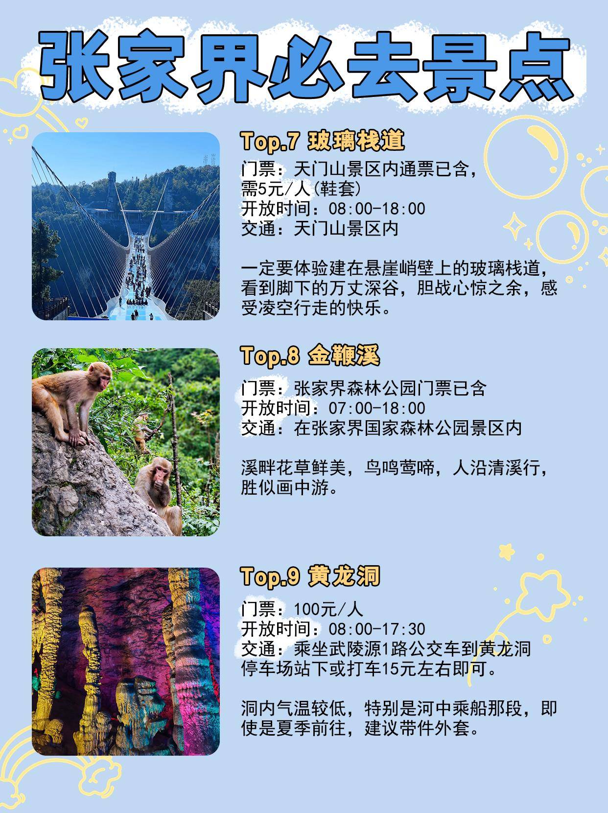2、季節(jié)選擇:張家界的四季風(fēng)景各異,游客可以根據(jù)自己的喜好和行程安排選擇合適的季節(jié)前往,春秋兩季是張家界的旅游旺季,景色宜人;夏季雖然炎熱,但可以去水上樂園等地方游玩;冬季雖然有些寒冷,但可以去滑雪場(chǎng)體驗(yàn)冰雪樂趣。